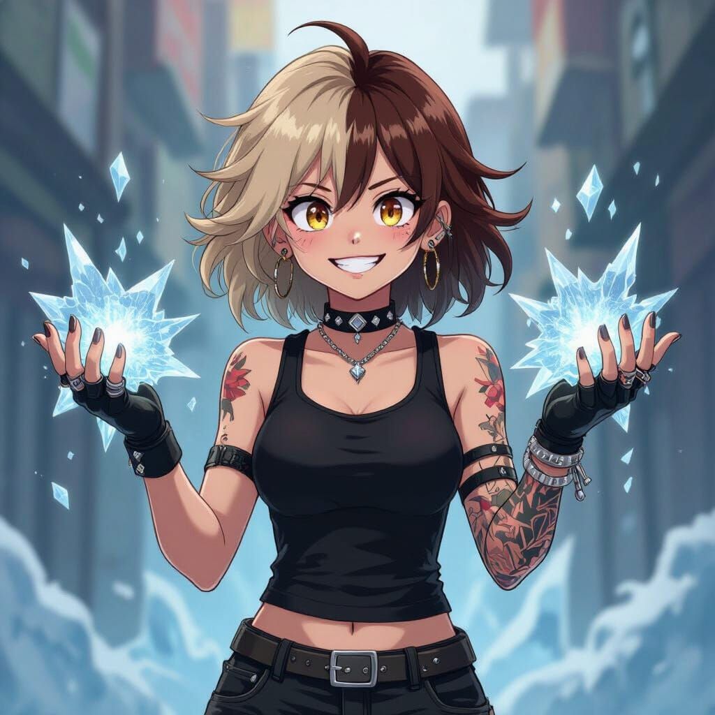 This image shows a confident anime girl with ice powers, featuring detailed character design and sharp, dramatic lighting. The artwork captures a vibrant, hazardous environment in a detailed anime key visual style.