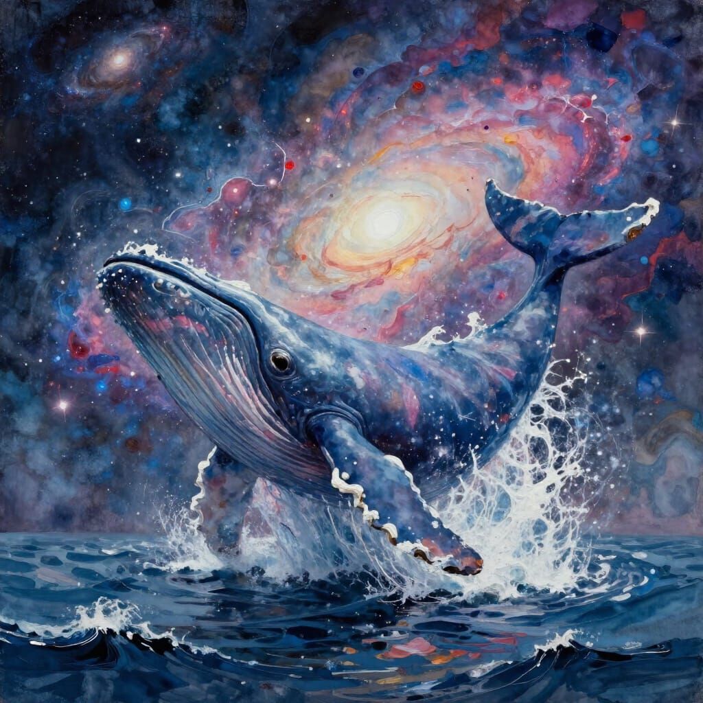 This image shows a colossal whale emerging from the sea, transforming into a nebula of galaxies and stardust. Rendered in a gouache style with textured brush strokes, it's an epic, impressionist masterpiece.