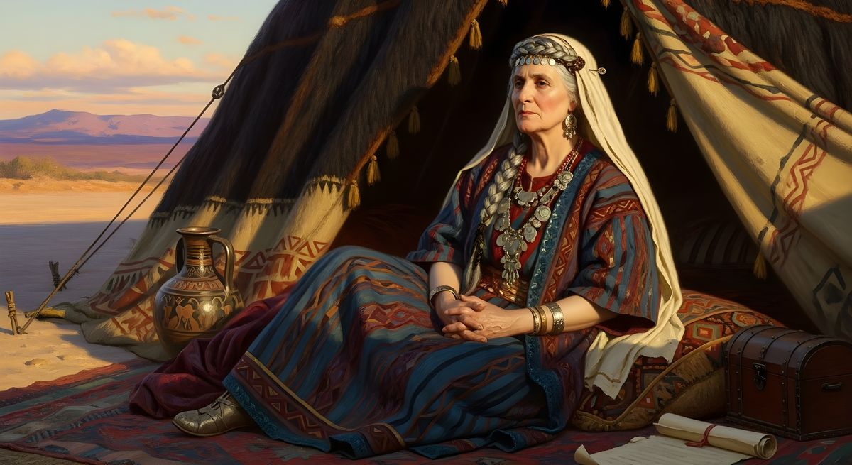 This image shows Sarah, a wealthy, elderly nomad woman in ancient Israel. The portrait captures a scene reminiscent of biblical times with stylistic elements from late 19th century art.