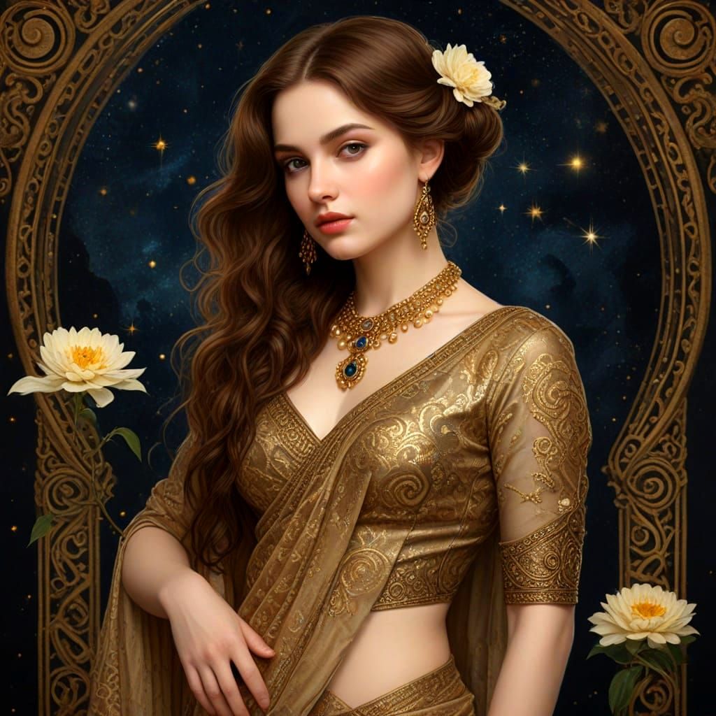 This image depicts a breathtaking woman wrapped in a luxurious saree, surrounded by a swirling vortex of flowers and esoteric patterns, set against a steampunk backdrop that blends ancient Indian and Victorian-era elements, with a warm, golden light illuminating her resplendent golden jewelry.