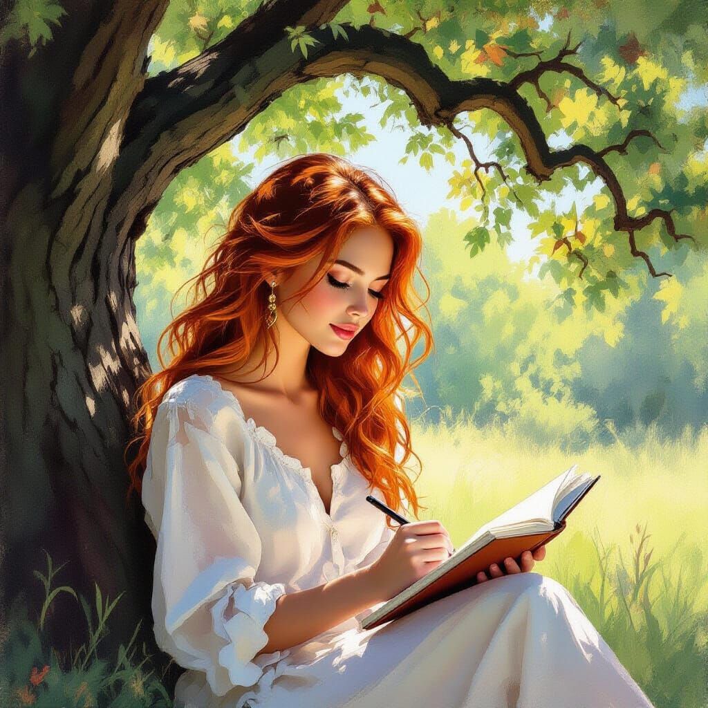 A vibrant image of a red-haired woman sketching under an oak. The artwork evokes impressionistic paintings through its use of light, gouache, watercolor techniques, and impasto textures.