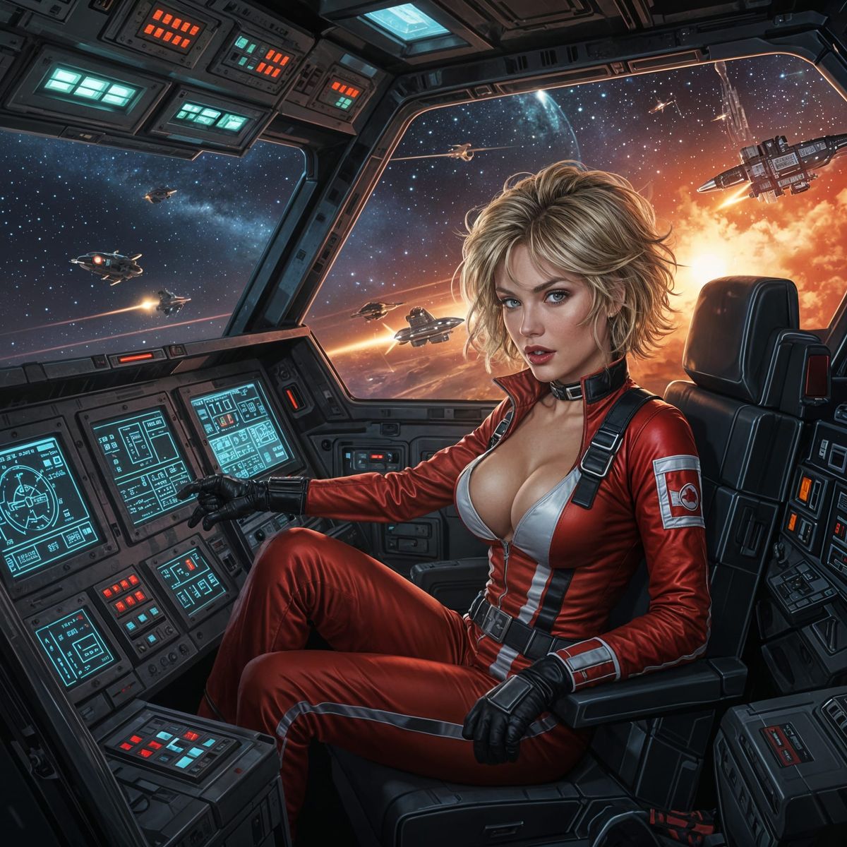 This image shows a female pilot in a damaged spacecraft cockpit during a fierce space battle. The detailed sci-fi illustration blends elements of classic fantasy and sci-fi art styles.