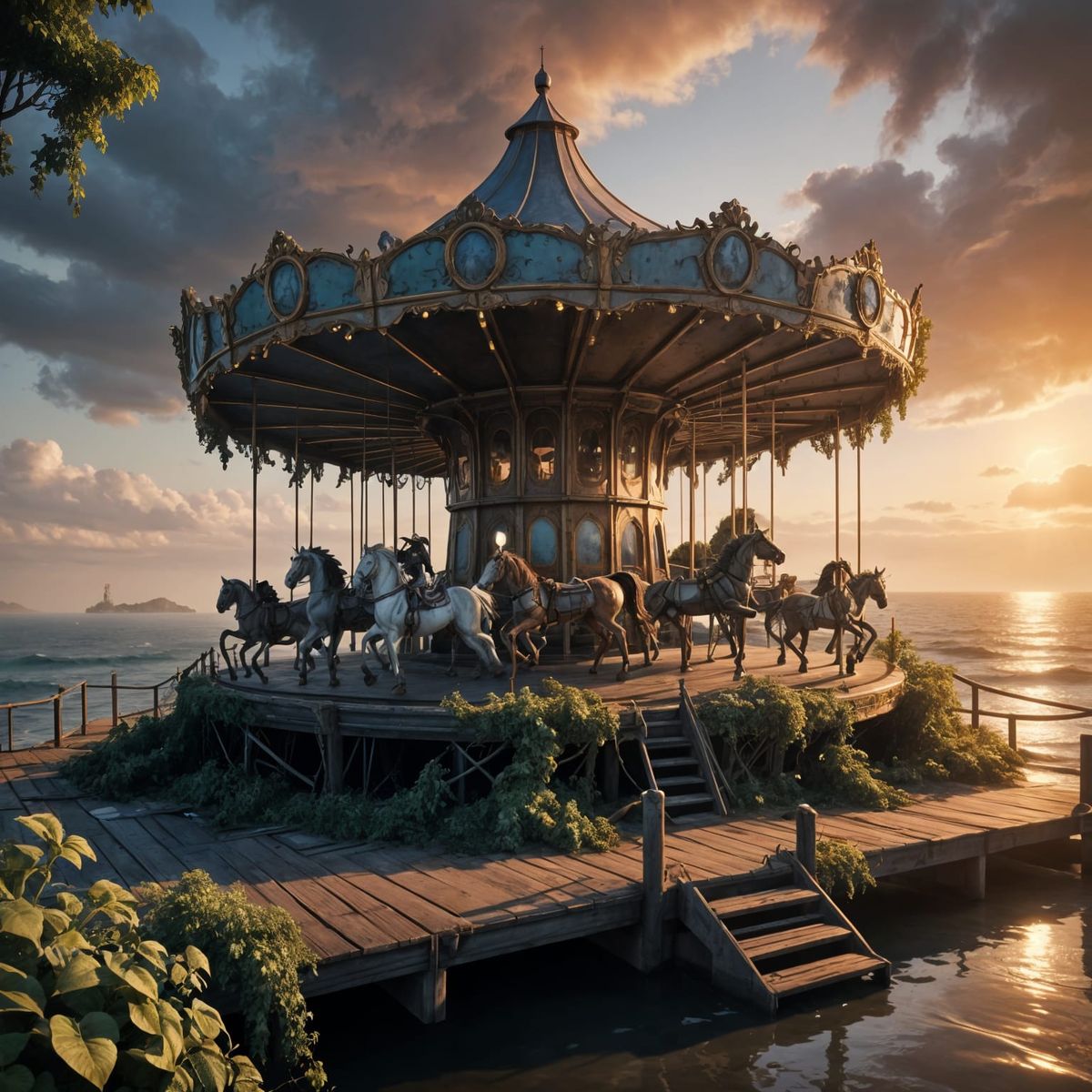 This image depicts a hauntingly abandoned carousel on the Santa Monica pier, overgrown with vines and showing signs of decay. The scene captures the derelict pier and ocean at sunset, rendered with detailed 3D game cinematic graphics and dynamic lighting.