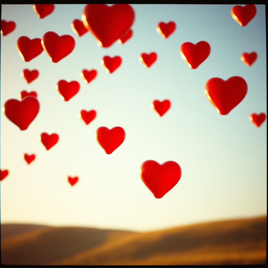 This image shows vibrant red heart emojis floating in the air. The image is styled to resemble a film still, with warm color grading, rich film grain, and dramatic lighting to create a nostalgic, ethereal mood.
