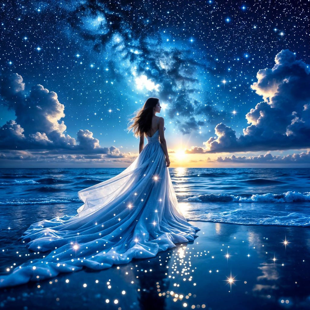 A mesmerizing image of a woman composed of starry clouds, surrounded by a sea and shore aglow with starlight. The scene is illuminated by moonlight and swirling, magical glitter, creating a celestial spectacle.