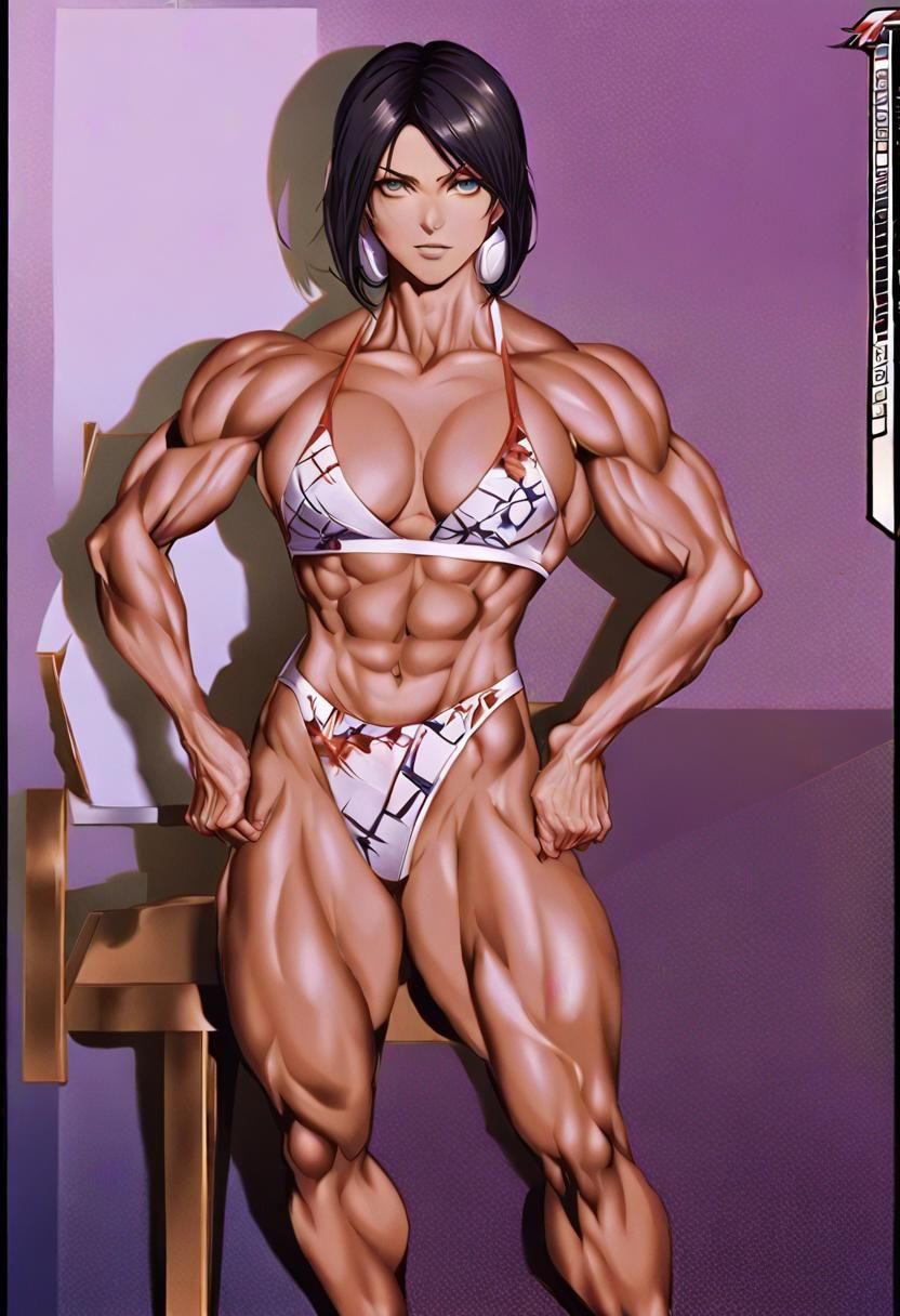 This image shows a long shot portrait of a muscular female athlete with black hair and hazel eyes. The character design is inspired by anime key visuals and features deep color and intricate details.