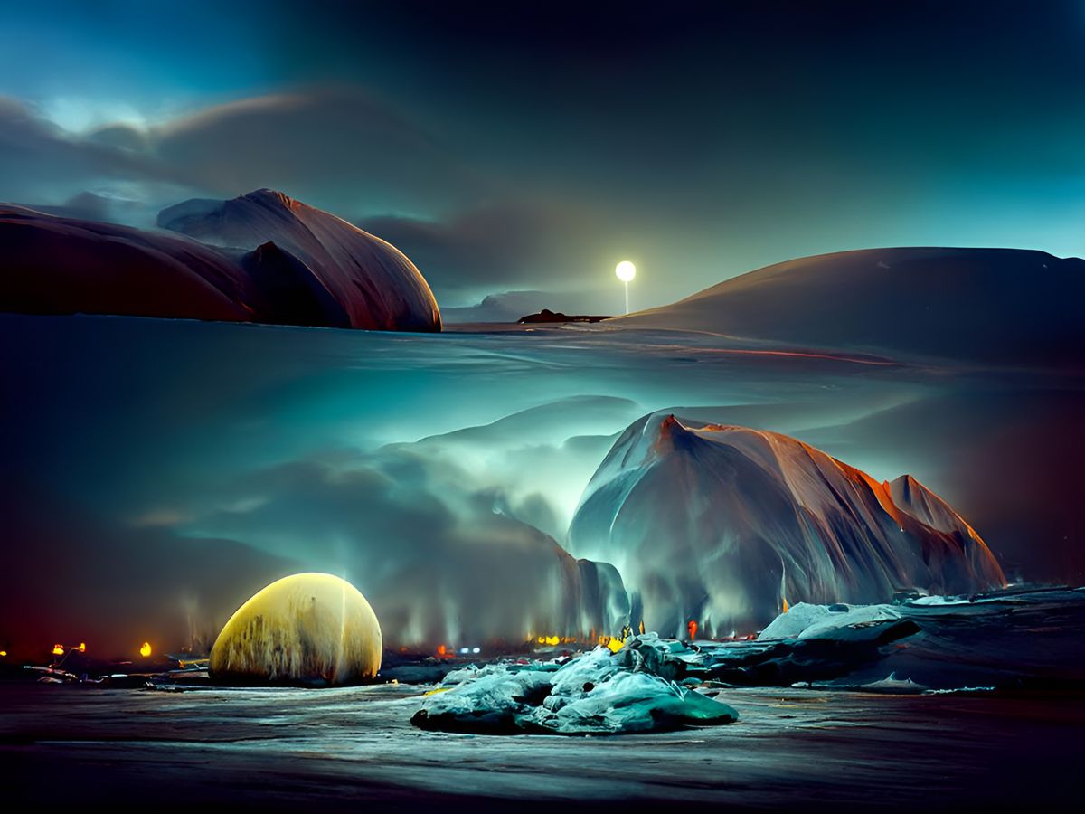 A vivid landscape photo of an alien polar region. The otherworldly scene evokes a sense of cold beauty, rendered as high-resolution digital art.