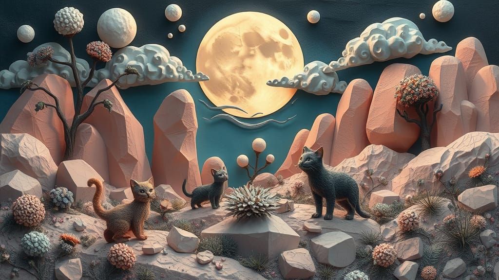 A serene and imaginative scene of cats in a fantastical landscape, bathed in soft pastel hues and textured shapes, evoking a sense of calm contemplation and three-dimensional depth.