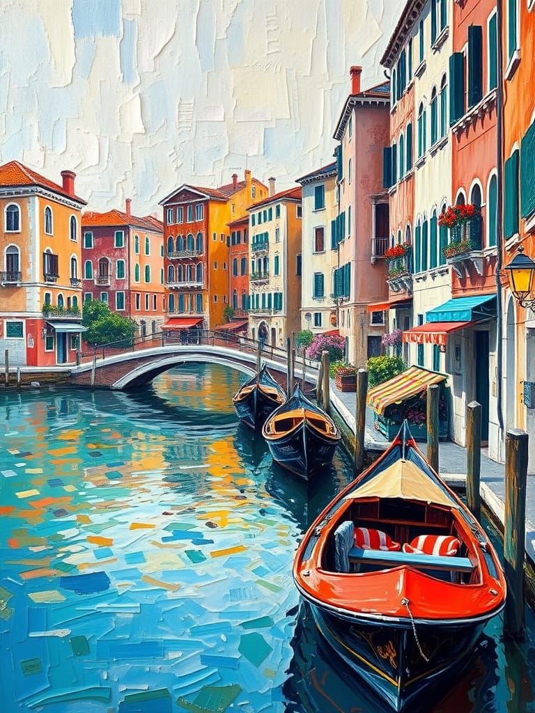 A vibrant view of Venice, Italy, featuring a beautiful river and charming boats. The scene is rendered in an expressionist style with thick layers of colorful, textured paint.