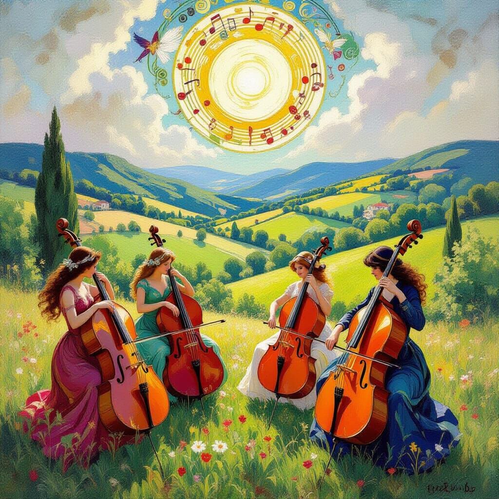 A vibrant image shows instruments in a sunny valley, with dancing creatures and musical notes. The art has an epic impressionist style, with layered watercolors and impasto brush strokes.