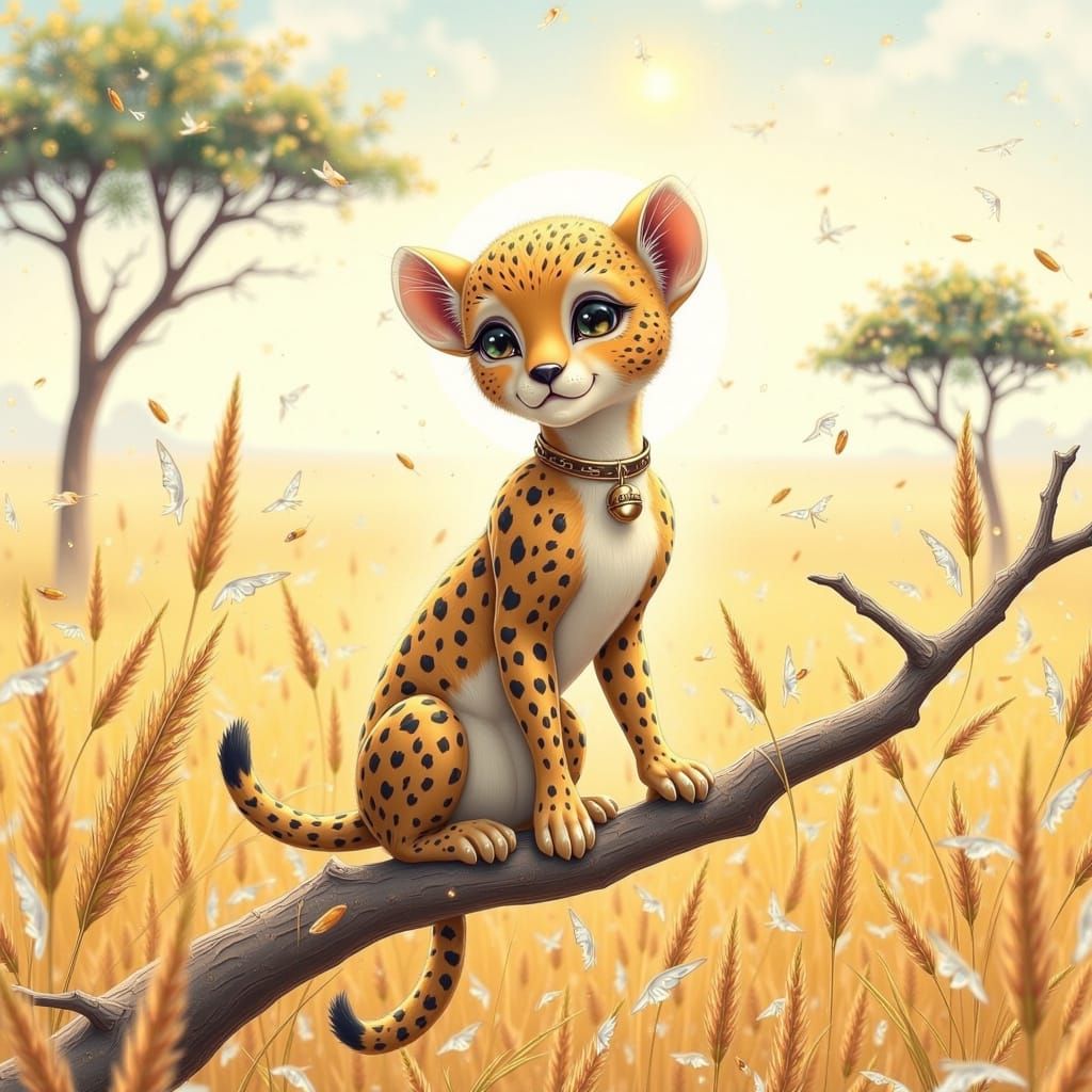 This image shows a captivating baby cheetah perched on a branch in the African savanna. Rendered in watercolor, the artwork evokes a dreamy, ethereal aesthetic with soft textures and delicate lines.