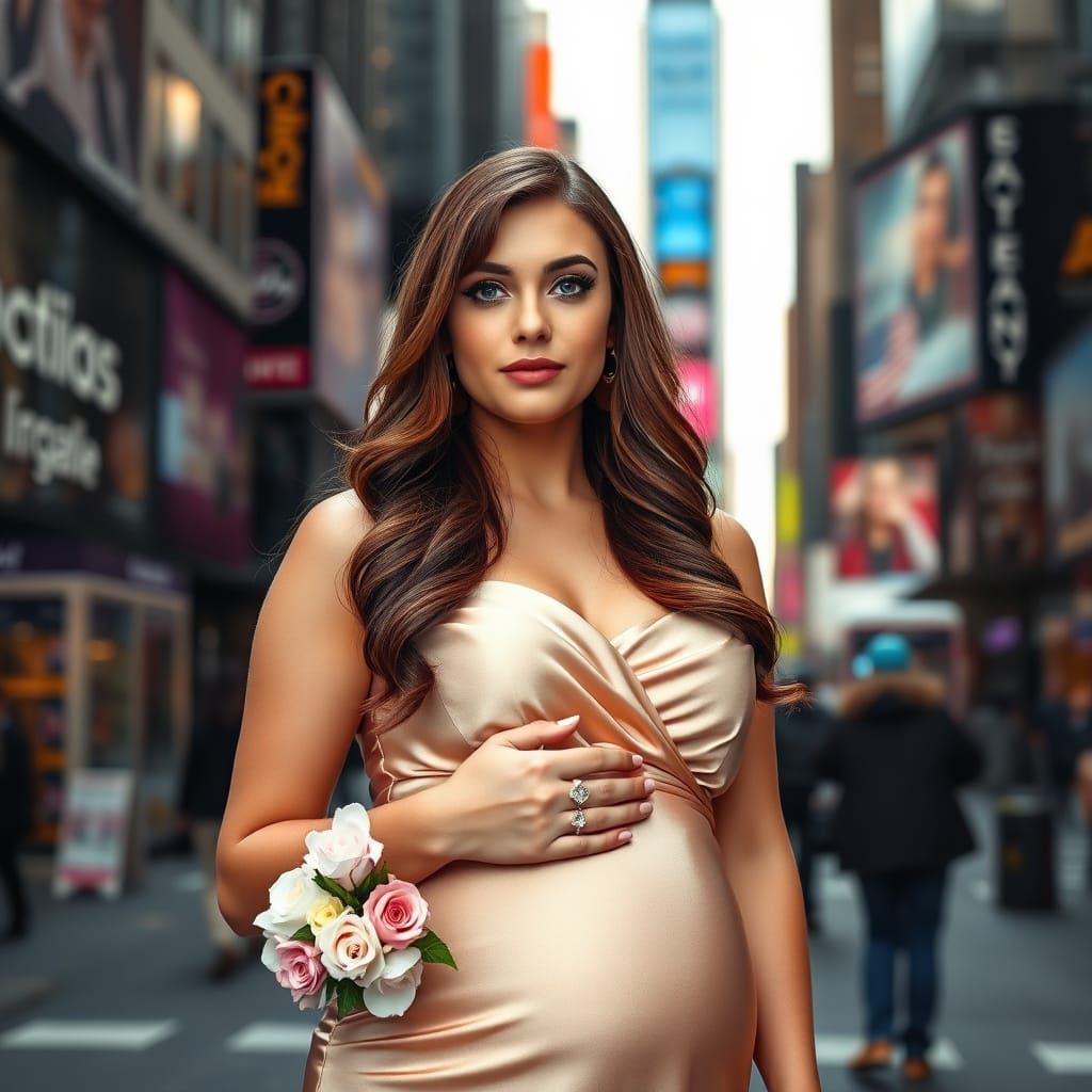 This image shows a curvy young woman in a satin dress standing in Times Square. The professional photograph captures her graceful, feminine presence with bokeh and natural lighting.