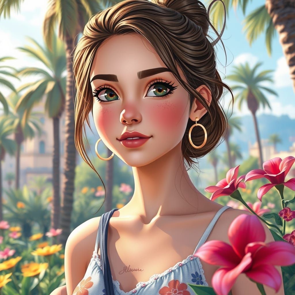 This image depicts a young woman surrounded by lush flowers and palm trees in a fantastical Spanish setting, rendered in a unique blend of digital and watercolor styles, with a futuristic and psychedelic atmosphere.