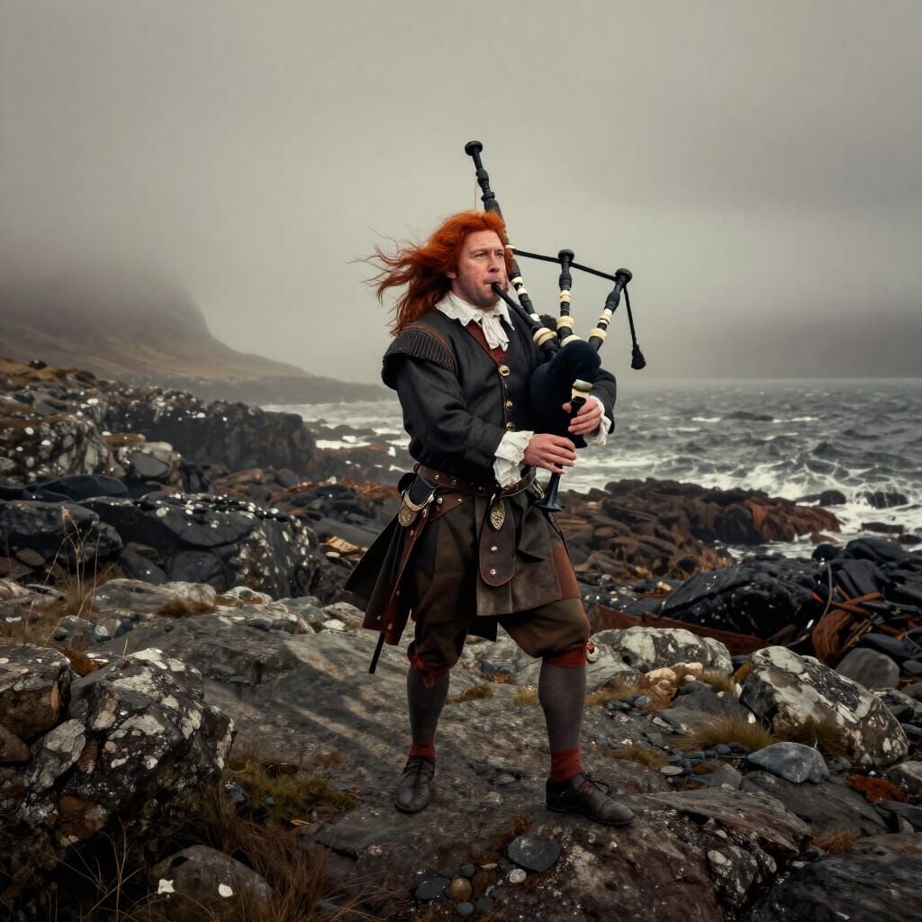 This image shows an 18th-century Scottish warrior playing bagpipes on a foggy, rocky coast. Rendered in a dramatic, painterly style with desaturated colors and rich texture.