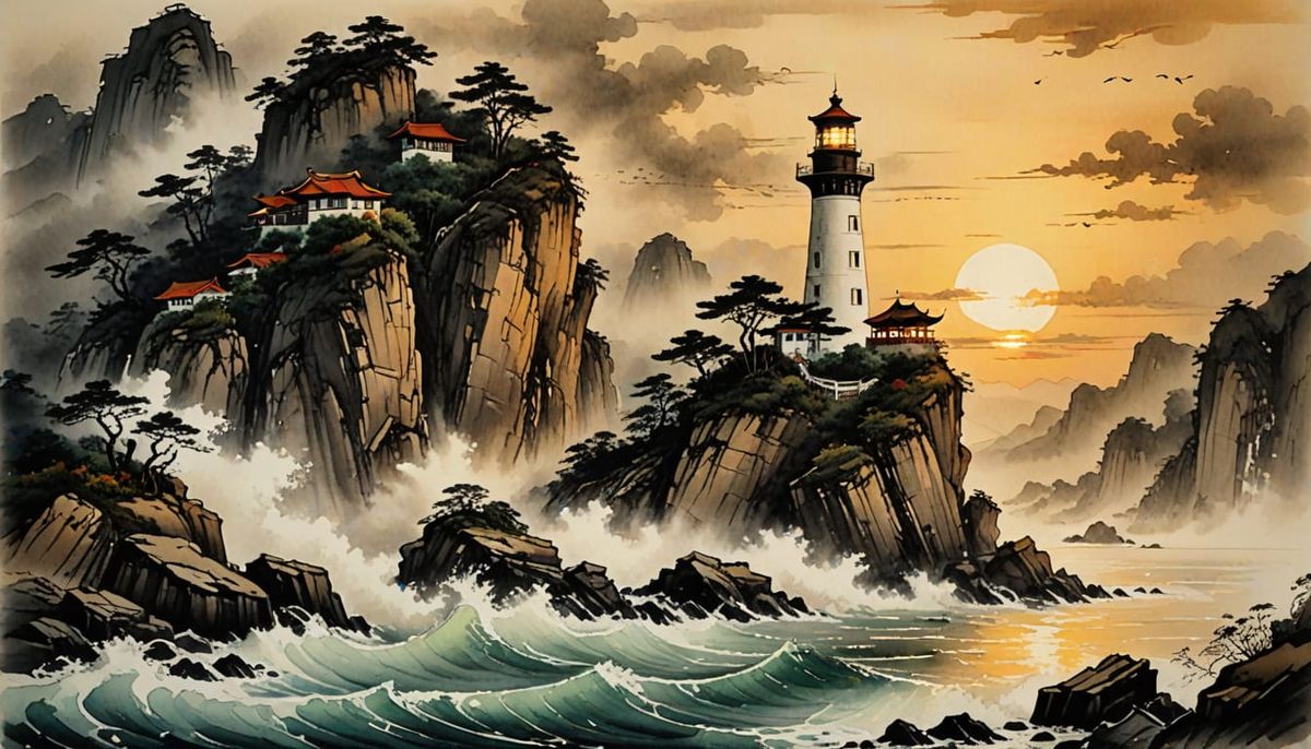 A digital painting of a lighthouse perched on a cliff as a storm approaches at sunset. This artwork evokes traditional Asian art with its delicate brushstrokes.