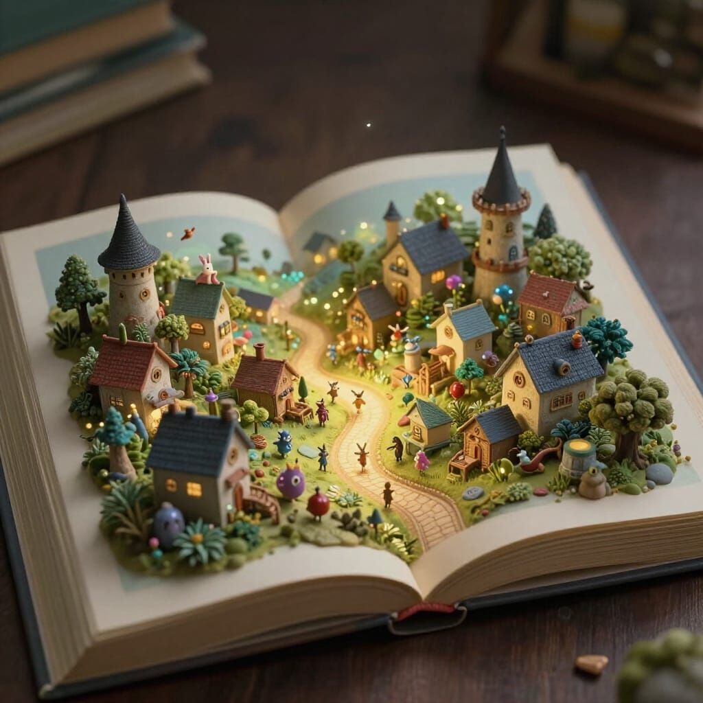This image depicts an open book revealing a magical 3D village bathed in ethereal light. Tiny creatures wander charming paths in a whimsical, cinematic style.