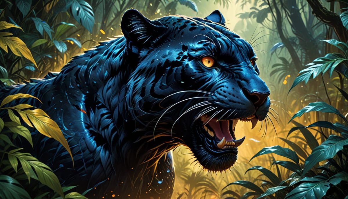 This image showcases a frenzied panther amidst lush, misty foliage, with dynamic, swirling patterns on its fur and intense, glowing eyes. Inspired by the comic book art styles of Mark Brooks and Dan Mumford, this 8k masterpiece features bold colors, intense textures, and dramatic, backlit lighting.