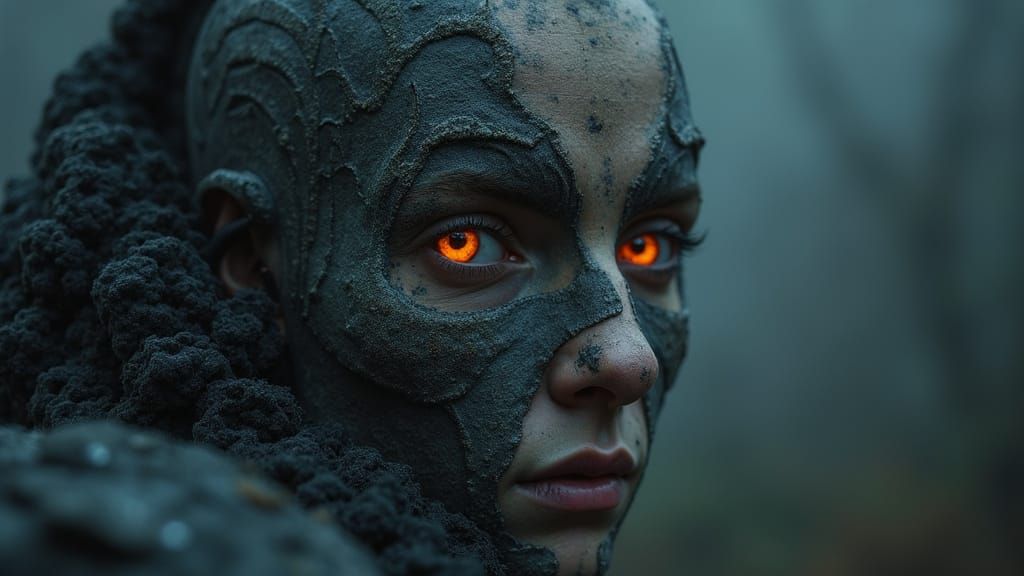 This image showcases a cinematic, hyperrealistic portrait with perfect composition and high contrast, featuring intricate details and a moody, atmospheric tone.