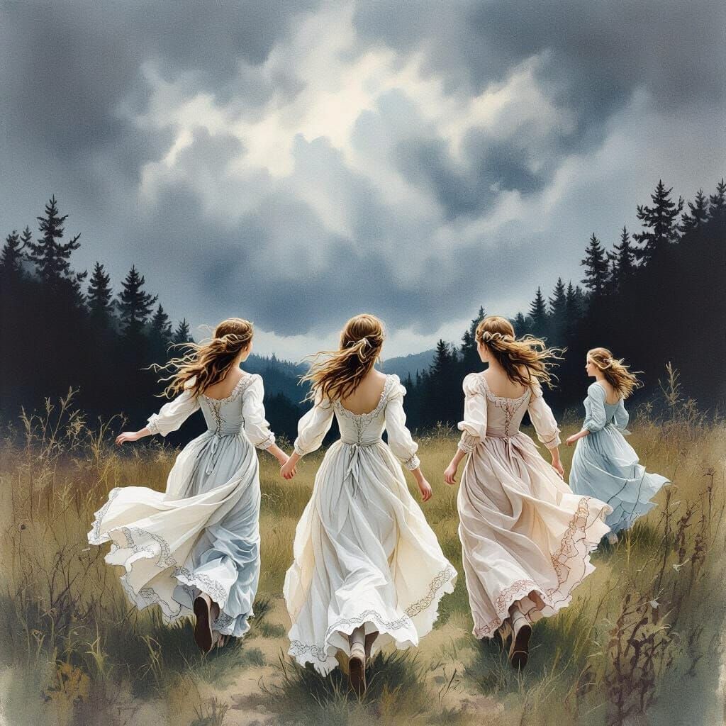 A panoramic view of three carefree teenage girls in Shakespearean dresses running toward a dark forest under a stormy sky. Rendered in a whimsical watercolor style with soft blended brushstrokes.