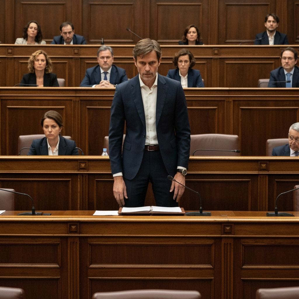 A tense scene of a fist about to strike a wooden table in a boardroom. People in professional attire look on with fear, lit by soft lighting, in a cinematic style.