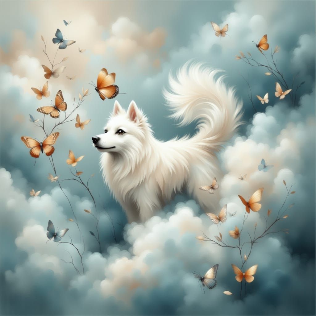 This image shows a fluffy white Japanese Spitz dog surrounded by swirling, multicolored butterflies. The scene is set against a misty, teal-blue cloudscape, rendered in a romantic digital drawing style.