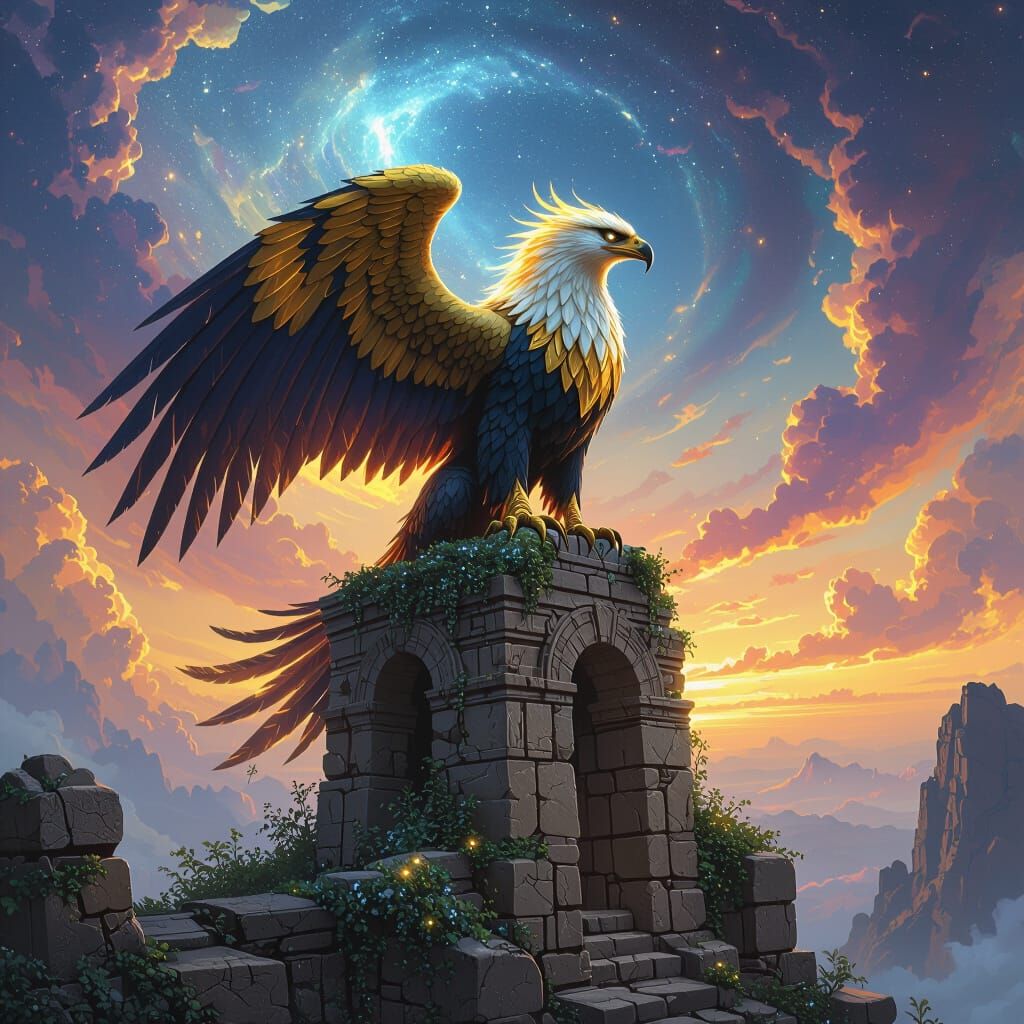 A majestic griffin with feathers like molten gold and obsidian, perched atop a crumbling, ancient observatory under a swirling nebula.