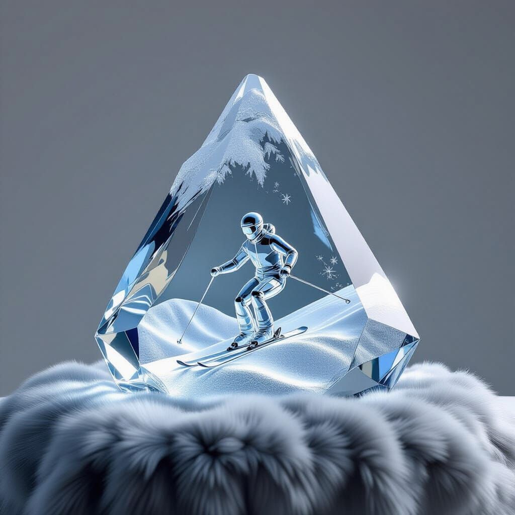 This image features a hyperrealistic 3D rendering of an abstract, transparent glass Swiss mountain sculpture with a glass skier. The detailed sculpture rests on a fur throw, with realistic lighting and shadows.