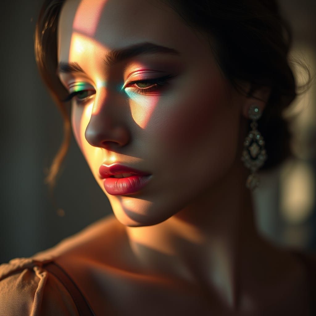 A hyperrealistic portrait of a woman bathed in warm light, featuring melting rainbow reflections on her skin. The image has a cinematic and atmospheric quality with soft, feathery bokeh.