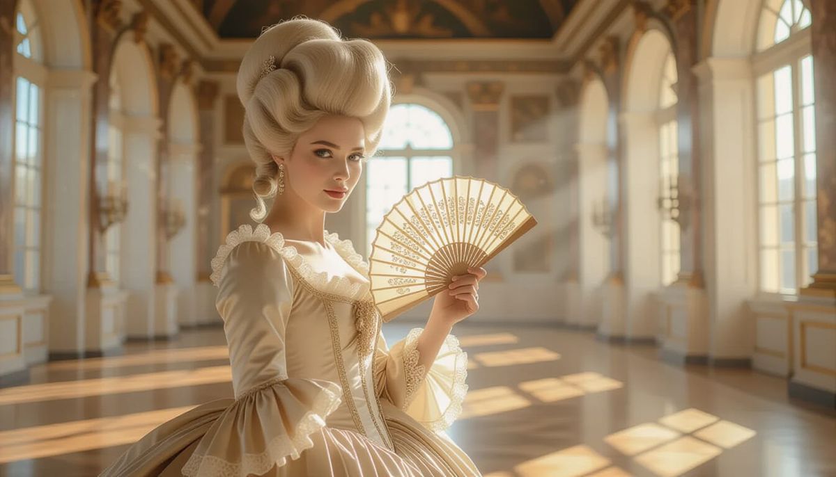 This photorealistic image depicts a young lady in an ornate 1770s gown and towering wig, fanning herself in an opulent palace ballroom. Soft light illuminates dust motes in the air.
