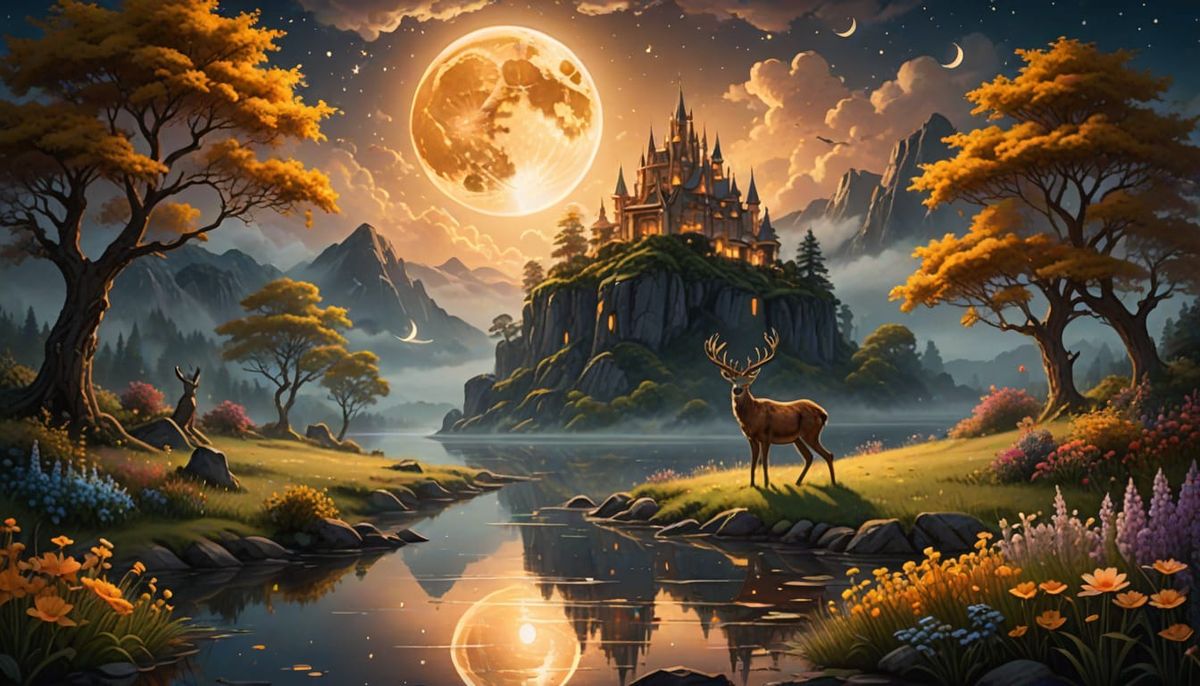 This image shows a cinematic fantasy garden at golden hour, featuring flowers, a tree, and mystical deer. Fog blankets the ground as a radiant full moon casts golden light, reflected perfectly on the water. The scene is rich with hyper-realistic reflections and warm tones.