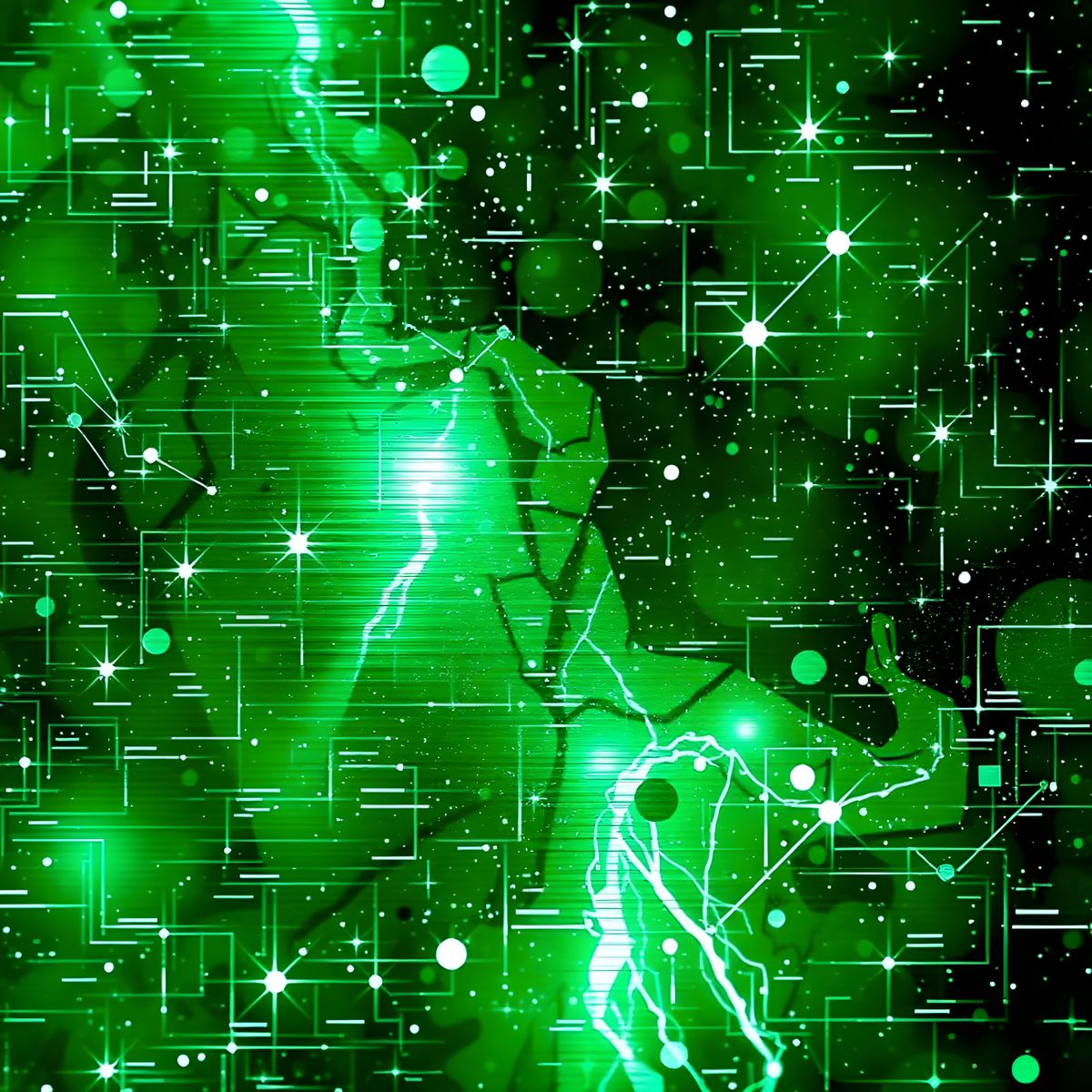 This vibrant digital artwork showcases a maximalist cosmos with shimmering silver and emerald green hues, featuring glitch art and abstract elements.