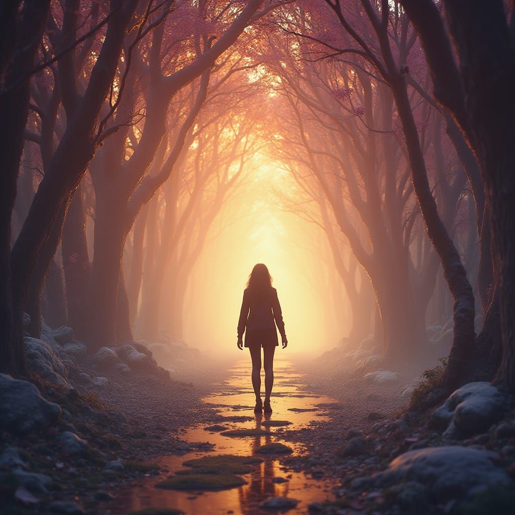 A traveler is silhouetted in a glowing corridor of spiral blooms. The fractal glyphs and memory-thread shrine give a mystical, ethereal quality, enhanced by soft-focus and subtle glitches in a surreal style.