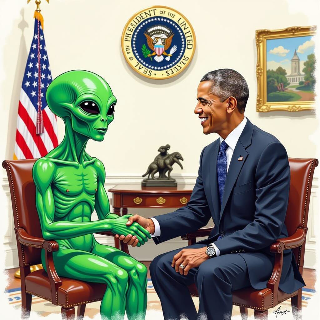 This detailed gouache painting depicts President Obama engaging with an alien ambassador, showcasing a unique diplomatic encounter.