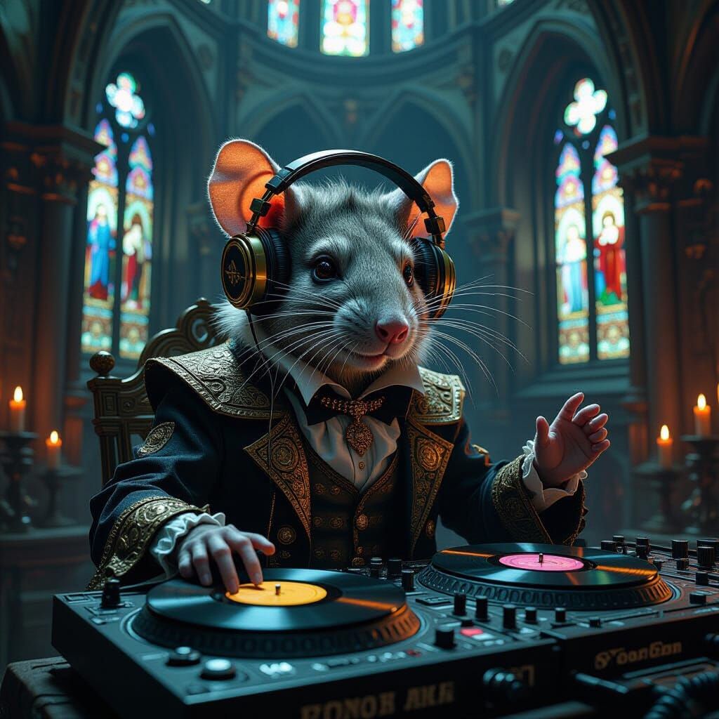 A bizarre rat DJ in Victorian clothing plays vinyl in a cathedral. The image features gothic architecture and stained glass windows, lit by candlelight, in the style of eldritch horror.