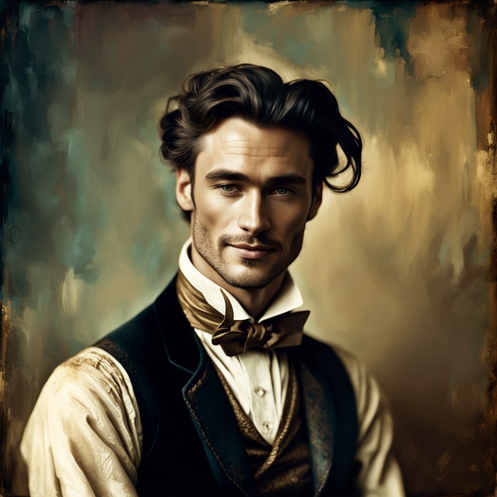 This image shows a portrait of a young man with sharp features and styled hair, wearing vintage attire. It blends impressionist oil painting with daguerreotype aesthetics and sepia tones.