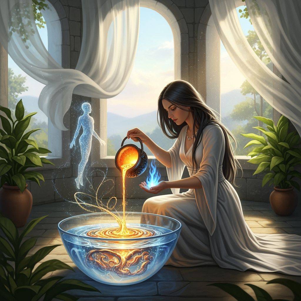 This image shows a woman melting lead and pouring it into water, creating swirling shapes. Energetic tendrils extend towards a translucent human figure, all within a bright, airy room filled with sunlight and shimmering light. A surreal digital art piece.