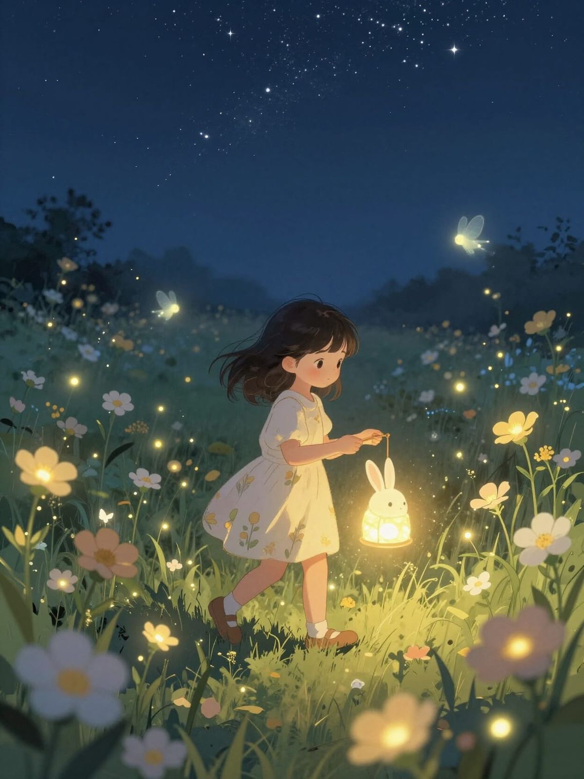 This image shows a young girl with a luminous rabbit lantern walking through a field of glowing wildflowers at night. Ethereal sprites resembling fireflies surround her, creating a scene of gentle magic.