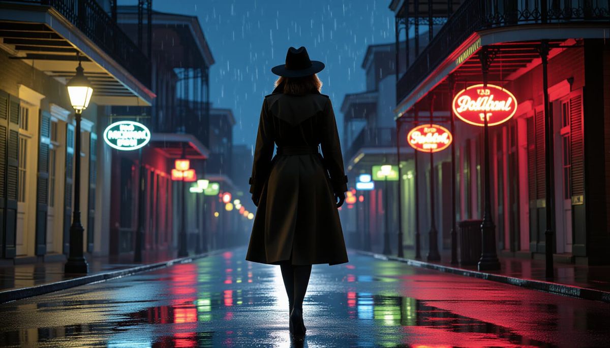 A dramatic image of a woman in classic detective attire silhouetted on a wet New Orleans street. Warm lighting and neon signs create a film noir aesthetic with hyperdetailed rendering.