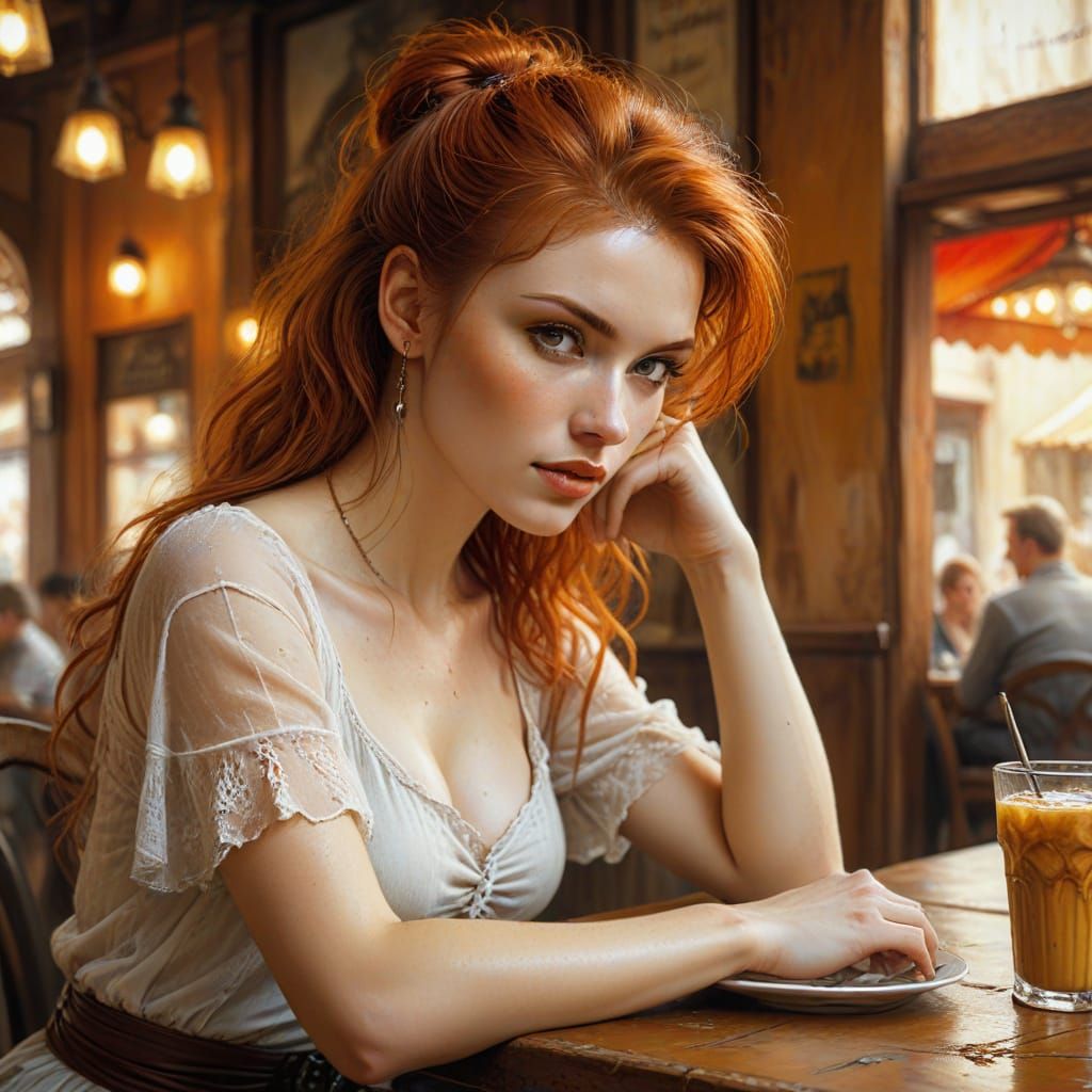 A striking picture of a red-haired woman at a cafe table. The scene is rendered with vibrant colors and bold brushstrokes, reminiscent of oil painting techniques. The artwork has warm earthy tones.