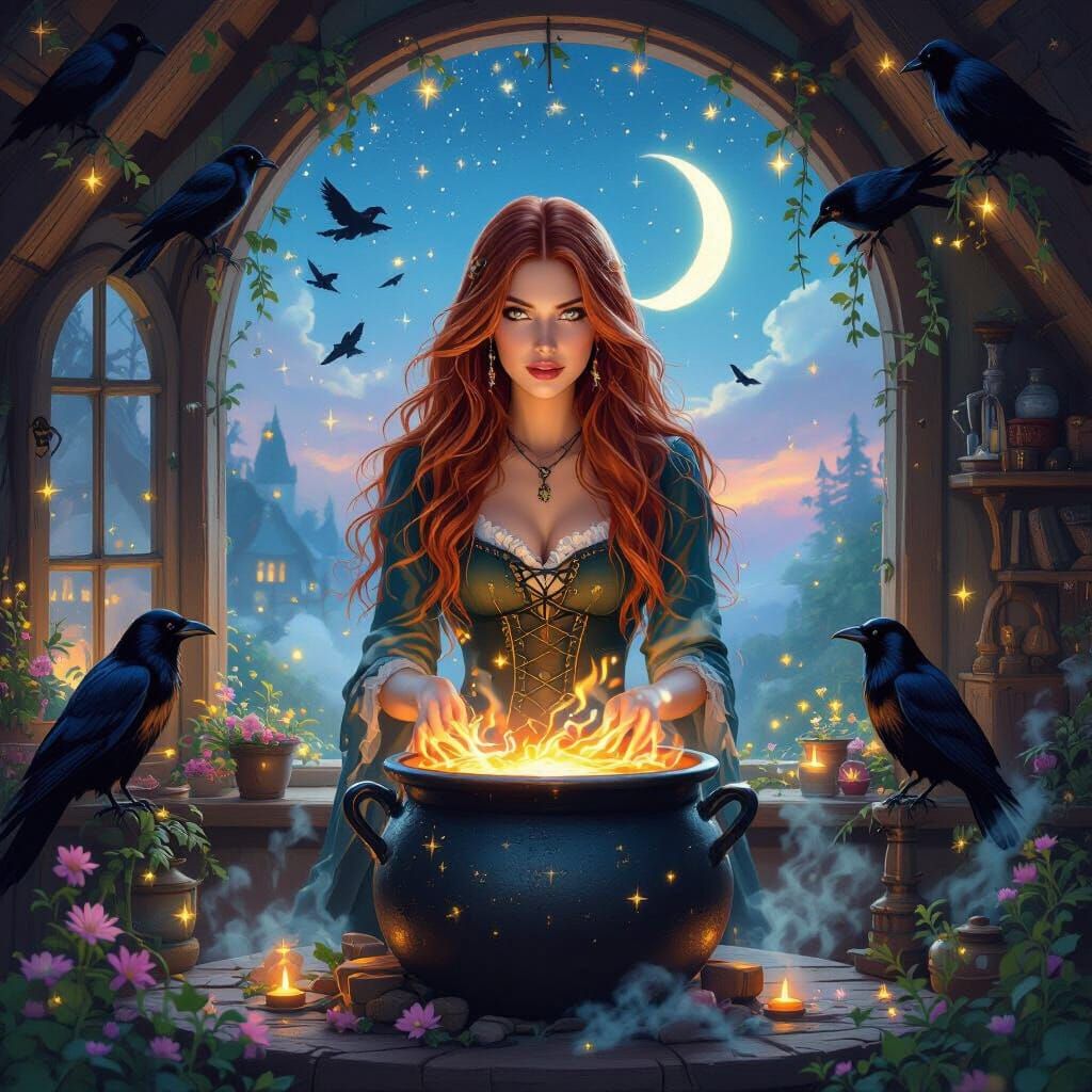 This image shows a red-haired witch in a cozy cottage with a bubbling cauldron, illuminated by pastel fairy lights. Steampunk and Impressionist oil painting styles are evident.