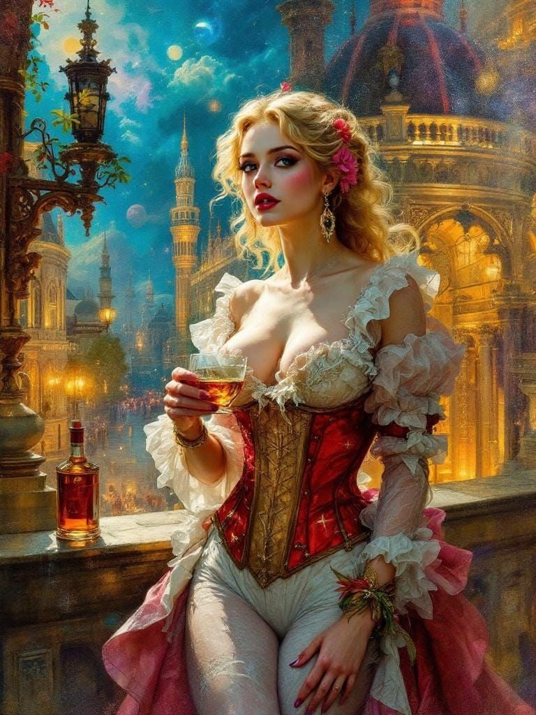 This image shows a pin-up style woman from the 1850s making eye contact. The art style combines surreal color, precise architectural perspective, and baroque dynamism with rich textures and golden lighting.
