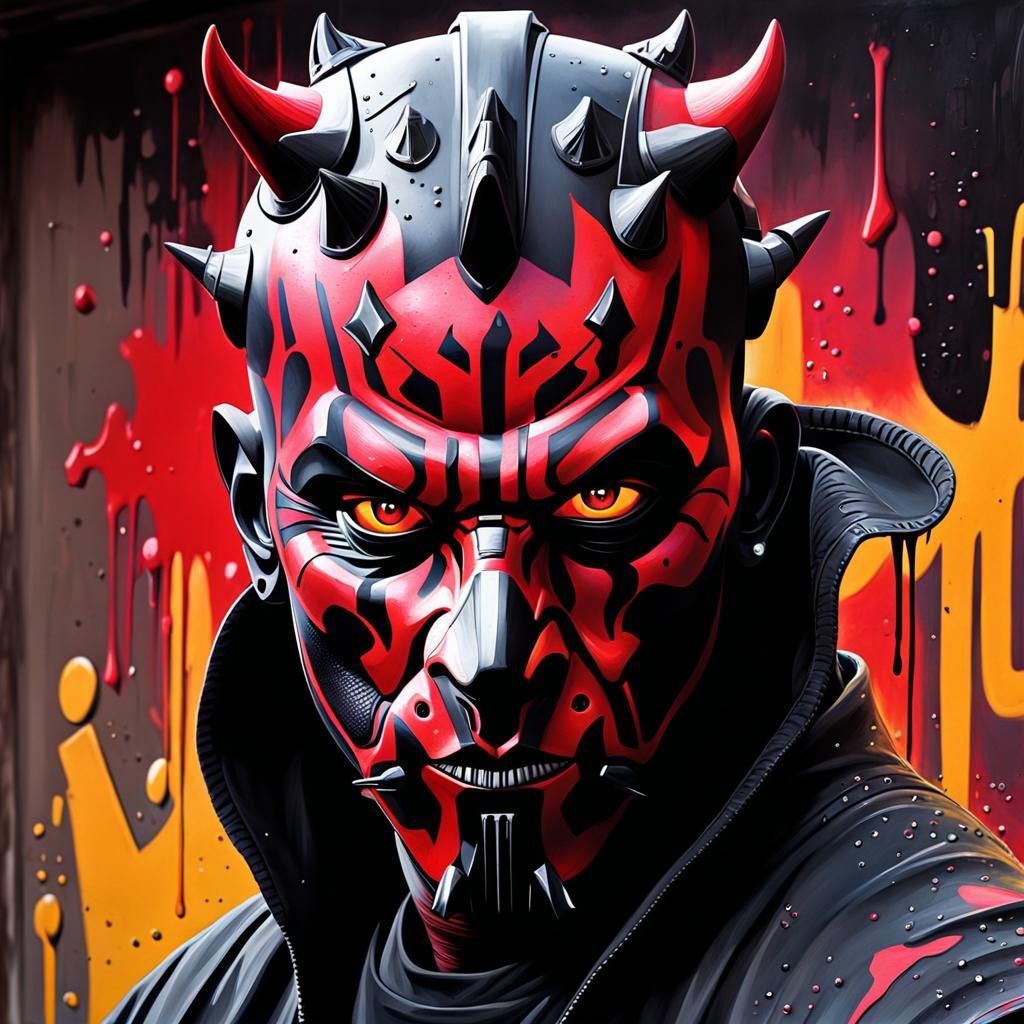 This image shows a graffiti-style depiction of Darth Maul. The artwork features high contrast and a colorful, polychromatic palette reminiscent of street art.