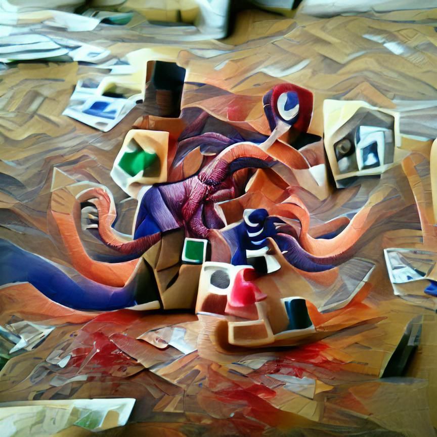 A vibrant cubist painting depicting an eldritch horror. The artwork features a bold color palette and fragmented forms to convey a sense of cosmic dread.