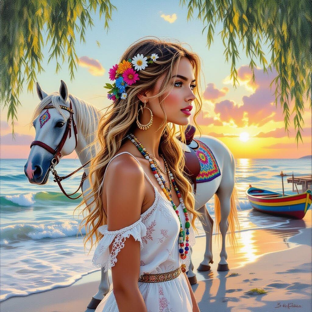 A portrait of a young and beautiful woman wearing a colorful, crochet dress, walking with a powerful white horse. Her horse has a mandala saddle, along with an intricate design, walking along the seashore at sunset. The scene includes the sky transitioning from blue to warm sunset, intricate weeping ...