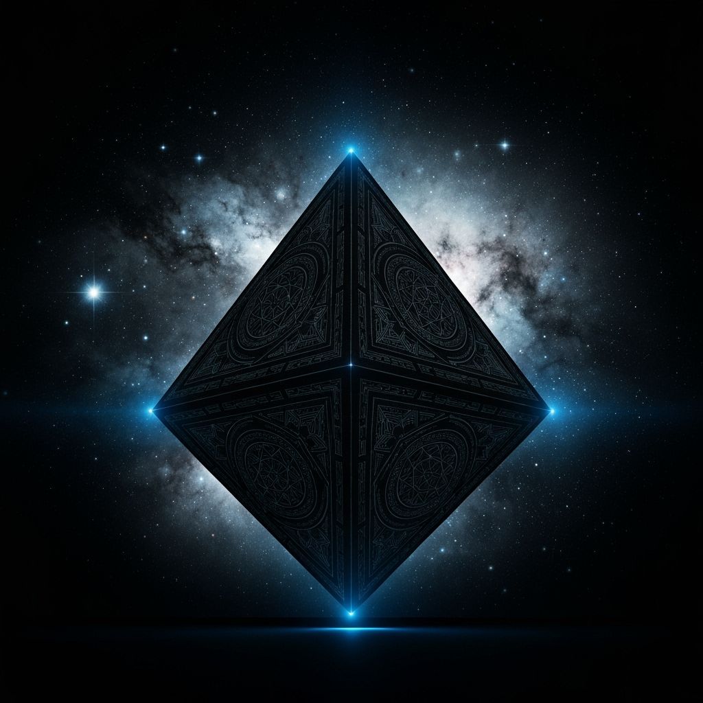This image shows an inverted black pyramid with geometric patterns against a dark, mystical background. The pyramid features intricate engravings suggesting a lost civilization, with swirling nebulae and vibrant neon blue lights in a futuristic aesthetic.