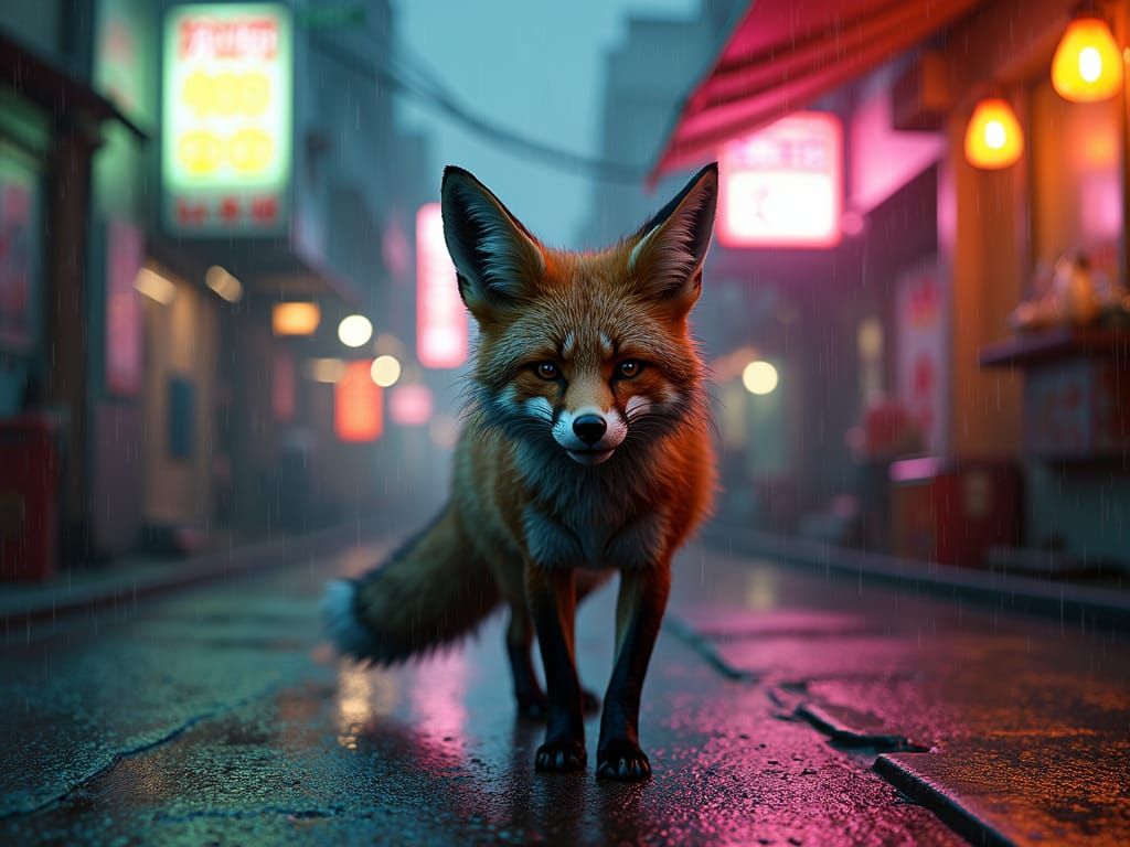 This image shows a cybernetically enhanced fox cautiously moving through a dark, rain-slicked alleyway. The scene is rendered with gritty textures, vibrant neon lights, and a cyberpunk aesthetic.