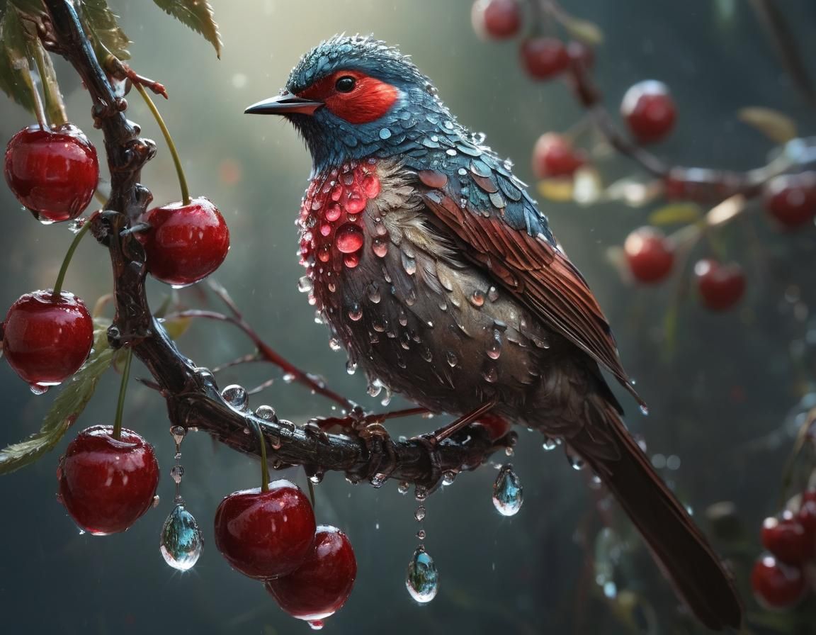A beautiful bird with dew-covered feathers perches on a branch, eating cherries. Soft, ethereal lighting enhances the textures in this elegant, highly detailed digital artwork.