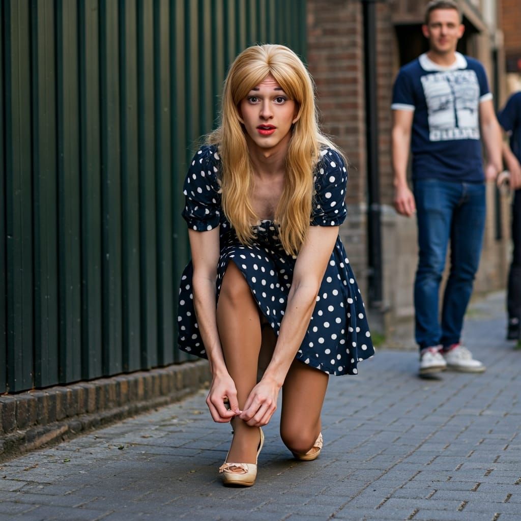 This image shows a young man with long blonde hair, dressed in a vintage polka dot minidress, lacing his heels on a sidewalk. Others observe with interest.