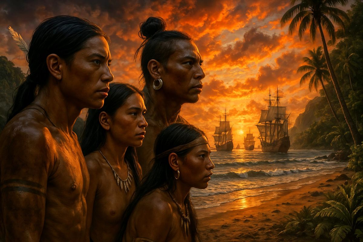 This image shows indigenous people on a tropical beach watching ships arrive on the horizon. The vibrant coastal landscape is depicted with hyperrealistic precision in the warm light of sunrise.