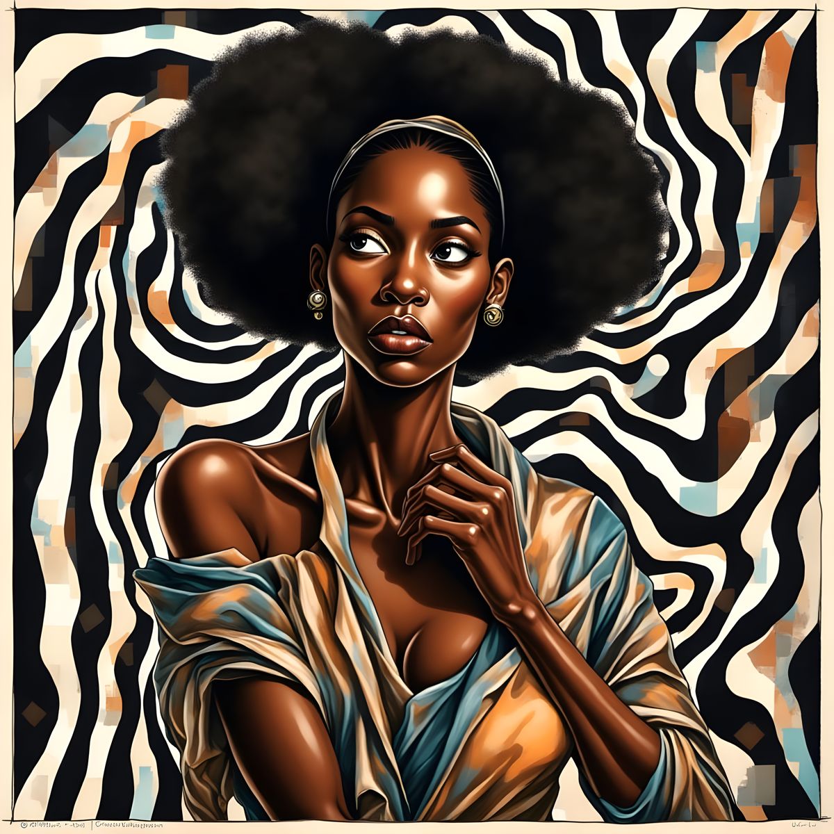 A striking illustration of a Black woman, blending Suprematist and abstract elements with glitch art effects. Features evolving patterns and dynamic contrasts.